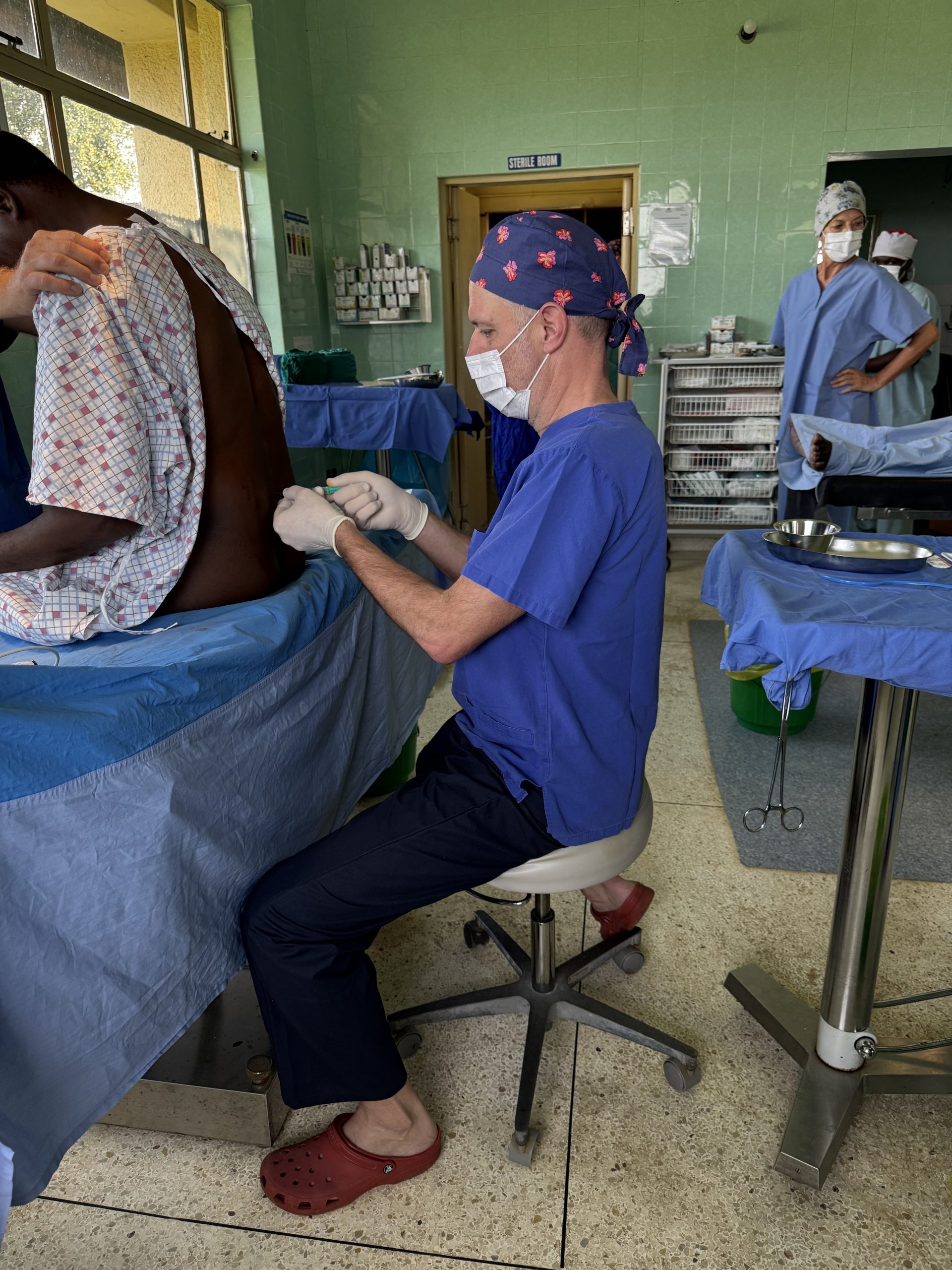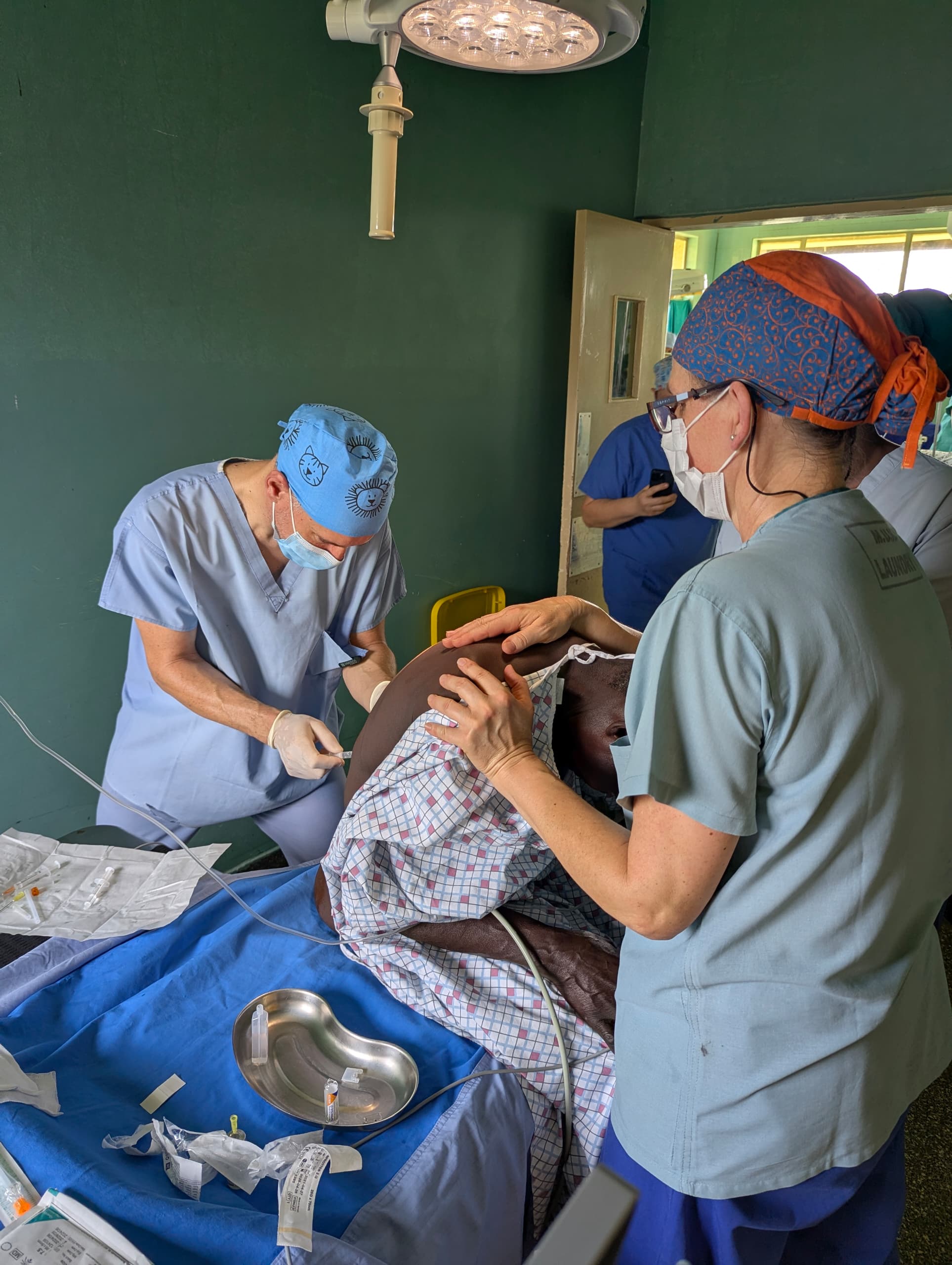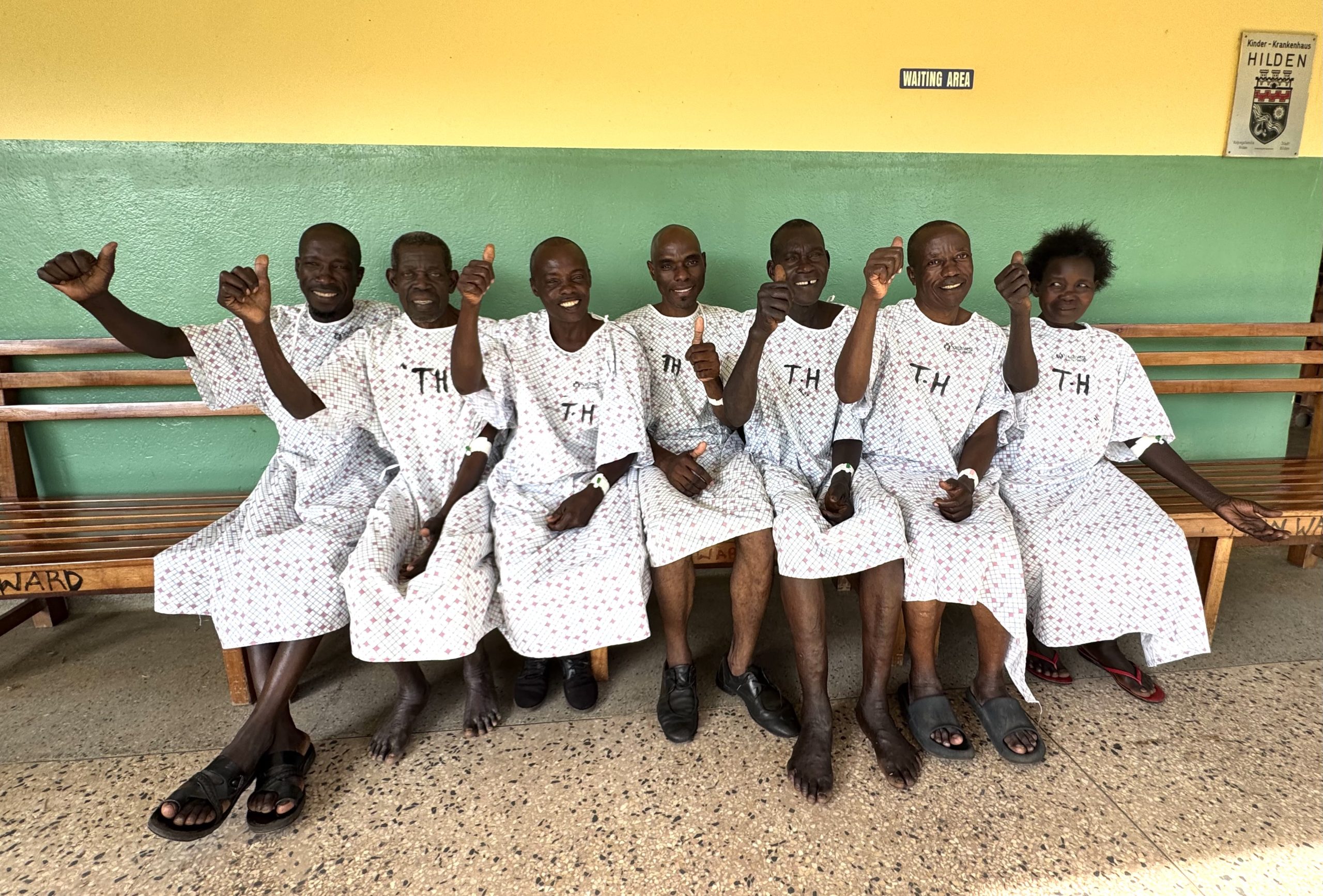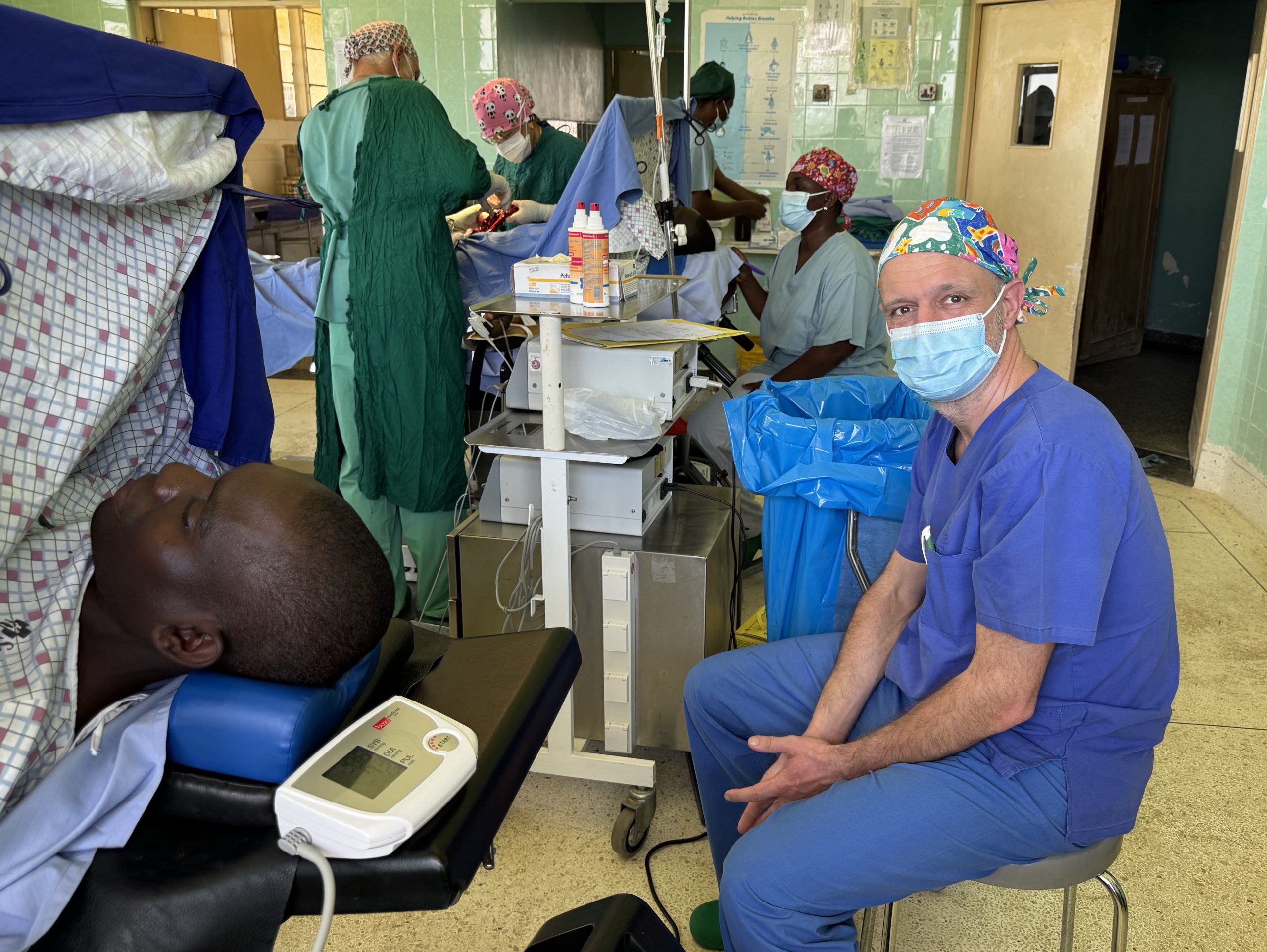 Pünktlich um 7.30 Uhr fiel am Montag der Startschuss. Das lokale Team hatte die Patienten bereits vorbereitet: OP-Hemden angezogen, Infusionen gelegt, alle saßen bereit – strahlend und voller Vertrauen. Innerhalb kürzester Zeit war das Team perfekt eingespielt, die Abläufe griffen Hand in Hand ineinander. Gleich am ersten Tag legten wir mit 27 Operationen einen grandiosen Auftakt hin.